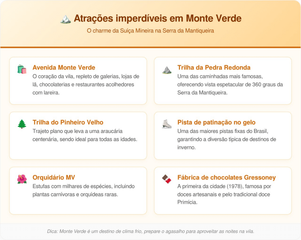 Monte Verde, distrito do município de Camanducaia, no sul de Minas Gerais, consolidou sua fama como a “Suíça brasileira” – o refúgio perfeito para quem busca baixas temperaturas sem sair do país. Localizada a cerca de 160 km da cidade de São Paulo, a vila combina o encanto natural da Serra da Mantiqueira com construções de estilo alpino, atraindo casais e famílias que desejam experimentar o “clima europeu” em solo mineiro.