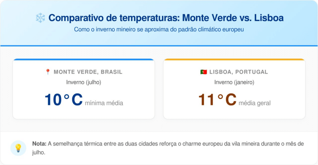 Abaixo, uma comparação entre as médias térmicas de Monte Verde e Lisboa (Portugal), mostrando como o inverno mineiro se assemelha ao inverno europeu (que ocorre em janeiro):