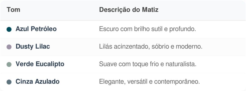 Abaixo, detalhamos alguns dos tons frios mais atuais que estão em alta nesse mês: