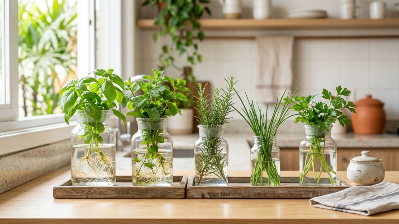 Ter uma cozinha com cheiro de horta é tendência por unir praticidade, frescor e decoração natural. Veja como cultivar temperos em potes de vidro com água e manter sua cozinha sempre aromática e funcional.