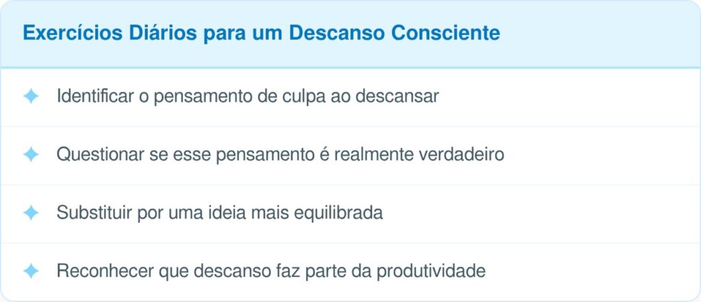 A reestruturação cognitiva é uma técnica da psicologia que ajuda a identificar e substituir pensamentos disfuncionais. Na prática, ela permite questionar crenças automáticas sobre descanso e produtividade. Veja abaixo algumas dicas de exercícios simples podem ser aplicados no dia a dia: