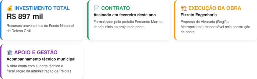 O contrato para a construção da ponte foi assinado em fevereiro deste ano pelo prefeito Fernando Marroni. O investimento total é de R$ 897 mil, com recursos do Fundo Nacional da Defesa Civil. Veja os detalhes do projeto:
