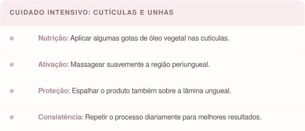 O banho de óleo noturno é simples e pode ser incorporado à rotina de cuidados com as unhas sem necessidade de equipamentos profissionais. A aplicação correta potencializa a regeneração da cutícula e melhora a aparência geral das mãos.