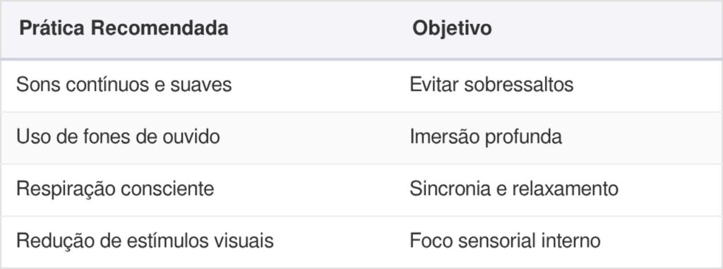 A técnica é mais eficiente ao usar fones de ouvido para imersão, combinando o áudio com respiração consciente e evitando estímulos visuais intensos durante momentos de autocuidado.