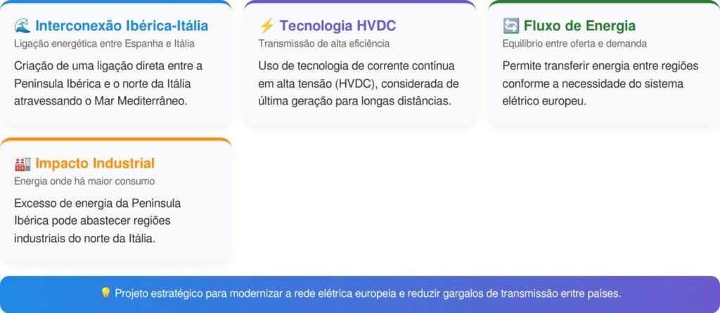 Os projetos criam uma ligação direta entre a Península Ibérica e o norte italiano, cruzando o Mediterrâneo com tecnologia HVDC de última geração. O objetivo é facilitar o fluxo de energia entre oferta e demanda. Veja os detalhes: