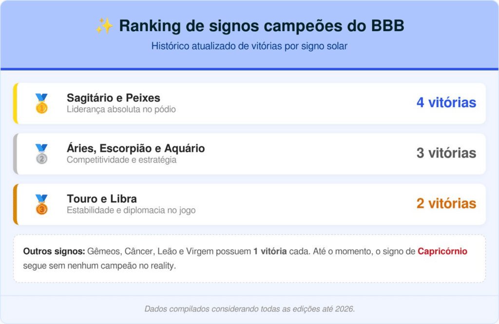 Ao analisarmos as 24 edições do programa, percebemos um domínio claro de elementos específicos que ressoam com o público brasileiro. Sagitário e Peixes ocupam o topo da lista com quatro vitórias cada, demonstrando que o otimismo e a sensibilidade são armas poderosas no confinamento.