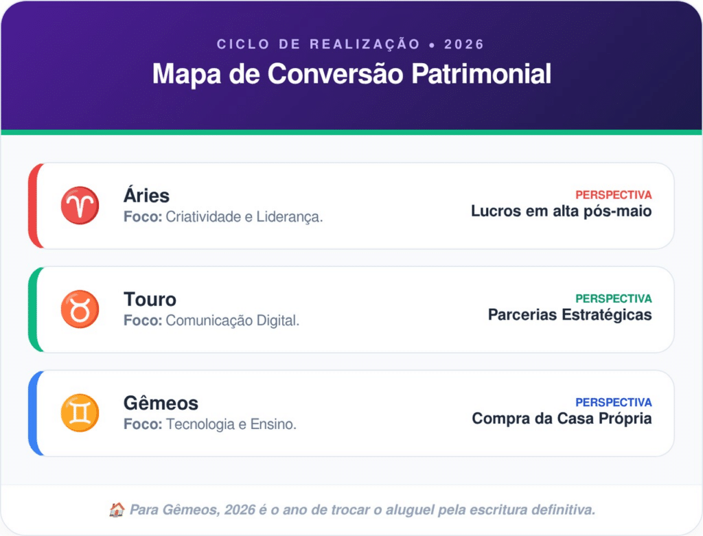 O ciclo atual estabelece uma hierarquia clara de facilidades, onde a proatividade dita o ritmo dos ganhos financeiros. Áries desponta como o grande protagonista e o signo mais afortunado de 2026, especialmente com a entrada de Júpiter em Leão no mês de junho.