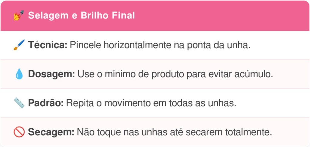 A selagem de ponta é um detalhe essencial no Efeito Glossy Francês, responsável por aumentar a durabilidade da esmaltação e evitar lascas precoces.