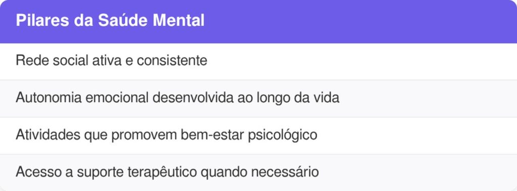 Listamos abaixo os pilares da saúde mental que garantem a autonomia emocional e o bem-estar psicológico contínuo: