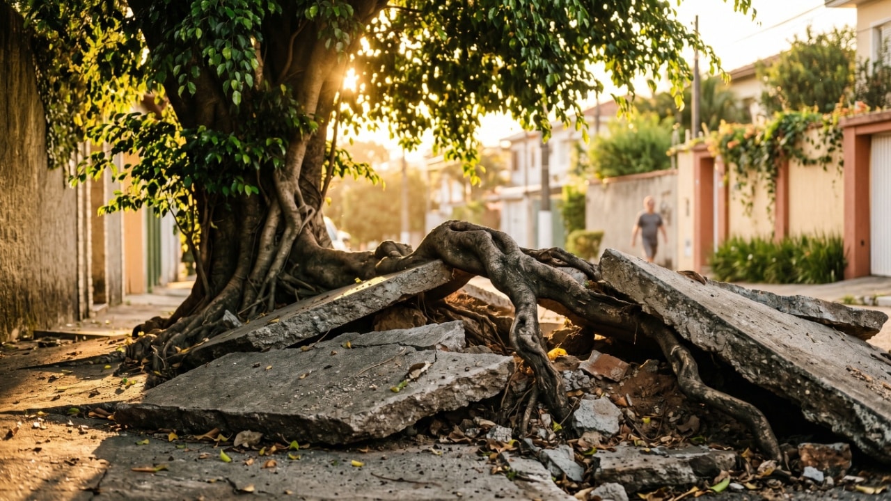 A escolha equivocada de espécies para a arborização urbana tem gerado prejuízos milionários em infraestrutura e riscos à segurança de pedestres. Raízes agressivas destroem pavimentos e invadem tubulações, transformando o benefício ambiental em um pesadelo logístico.