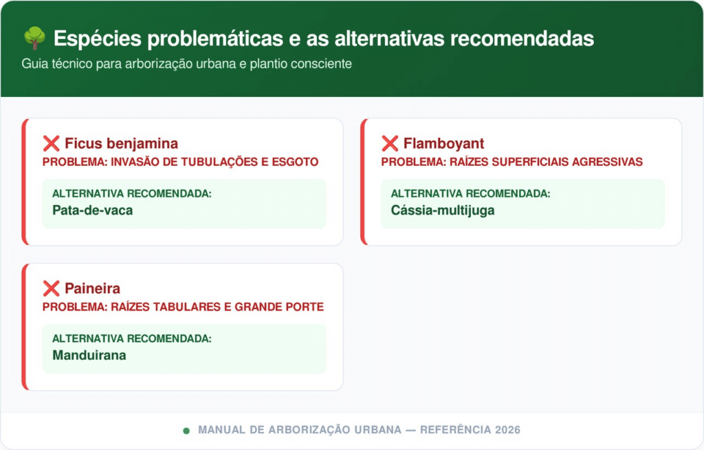 Abaixo, comparamos as espécies problemáticas e as alternativas recomendadas por especialistas para espaços limitados: