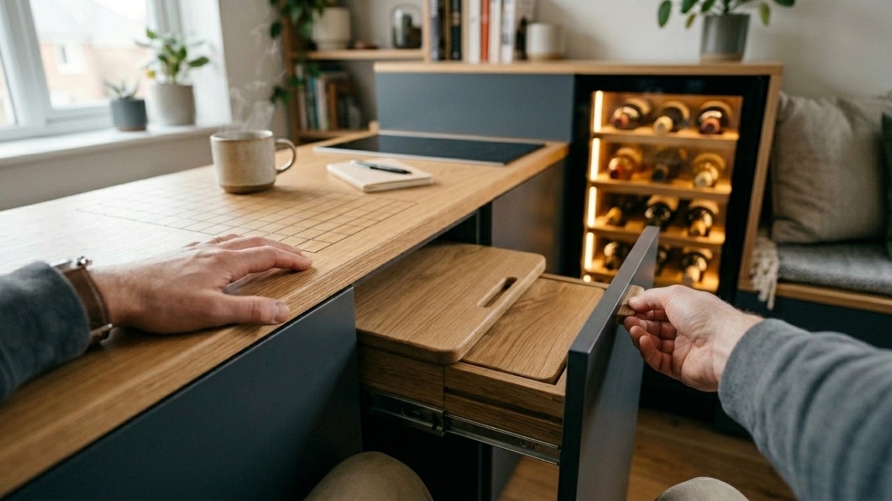 Móveis com funções duplas, como balcões que escondem banquetas ou adegas embutidas, são excelentes escolhas. O objetivo é manter a superfície de trabalho livre para o preparo de alimentos, garantindo que a funcionalidade técnica da cozinha permaneça intacta e organizada.