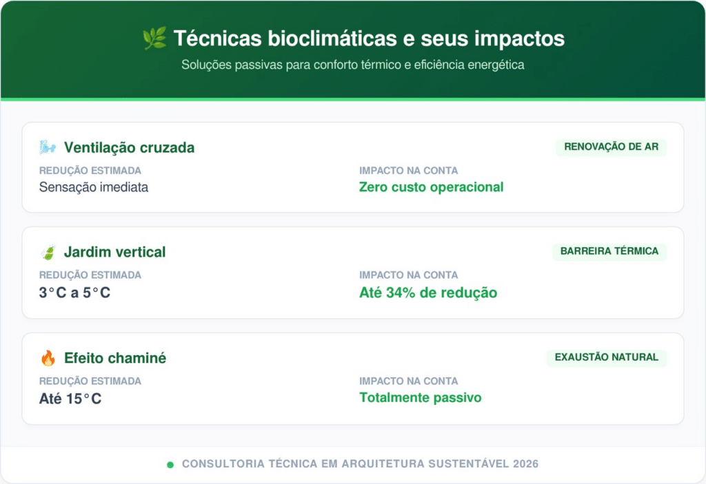 Abaixo, comparamos as principais técnicas bioclimáticas e seus impactos no resfriamento residencial: