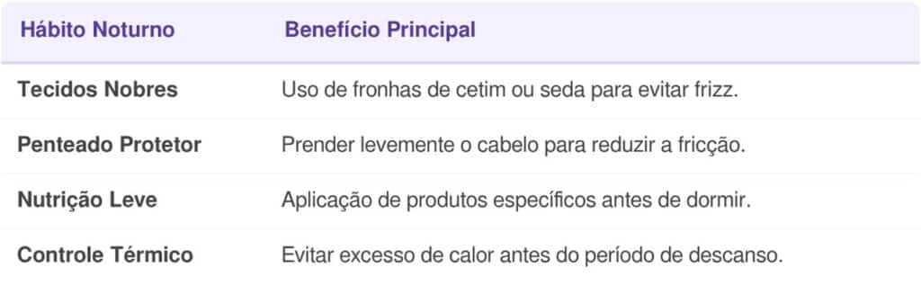 Conforme a tabela de hábitos noturnos, essa proteção é potencializada ao associar produtos de nutrição leve ao uso de tecidos nobres, como seda ou cetim
