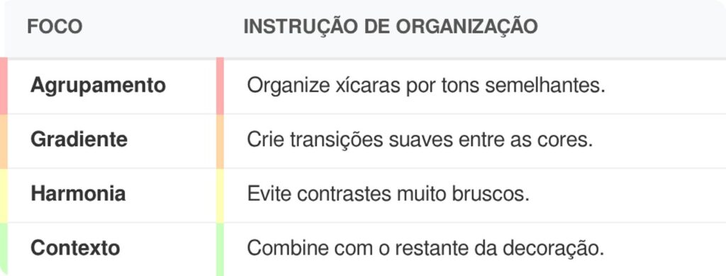 No design de interiores, o uso de cores é estratégico para organizar visualmente o espaço. Agrupar xícaras em degradê cria uma sensação de ordem e continuidade.