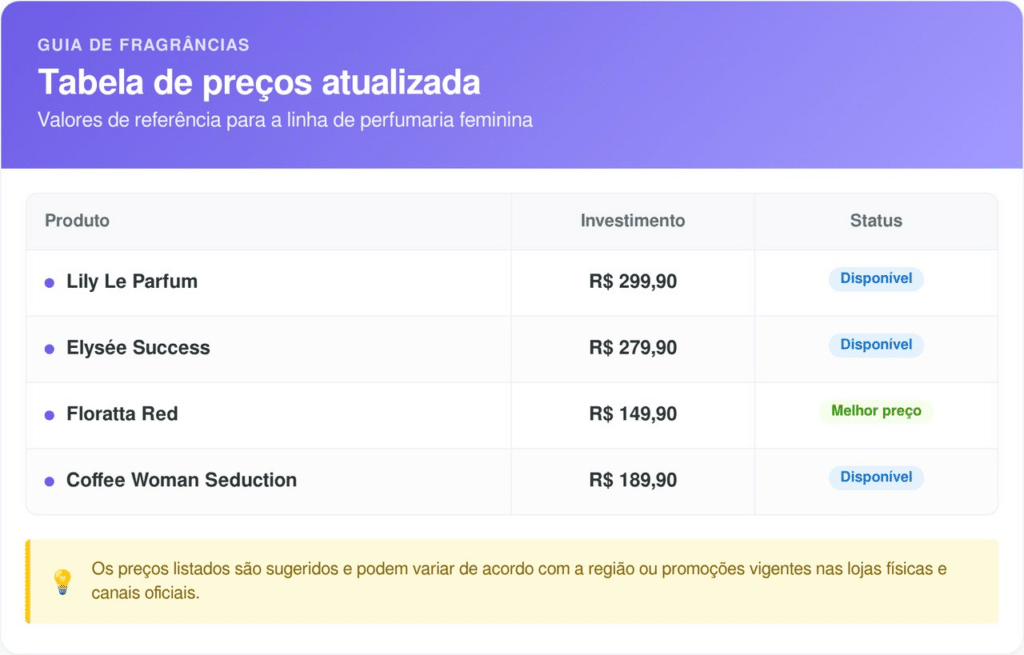 Pessoas com pele oleosa costumam ter uma retenção natural maior, enquanto quem possui pele seca precisa de reforço na hidratação. O clima também desempenha um papel importante, já que temperaturas muito altas aceleram a evaporação das notas de topo, as primeiras que sentimos ao abrir o frasco. Confira abaixo tabela de preços: