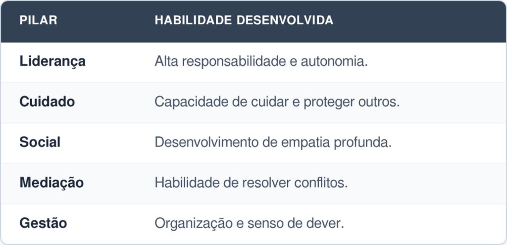 Confira a lista abaixo, que detalha os principais pilares envolvidos no desenvolvimento de competências socioemocionais e as habilidades práticas adquiridas em cada um deles: