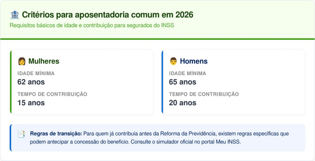 Desde a Emenda Constitucional 103/2019, a idade mínima tornou-se o pilar central do sistema previdenciário. Atualmente, para a aposentadoria programada comum, exige-se 62 anos para mulheres e 65 anos para homens, com o tempo de contribuição mínimo estipulado em lei.