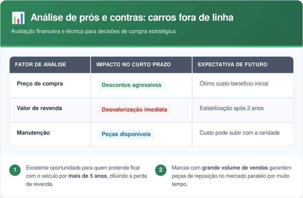 No primeiro momento, o anúncio de carros fora de linha costuma derrubar os preços no mercado de seminovos. O consumidor tende a evitar modelos descontinuados por receio de dificuldades futuras, o que gera oportunidades para quem busca um carro completo por um valor menor.