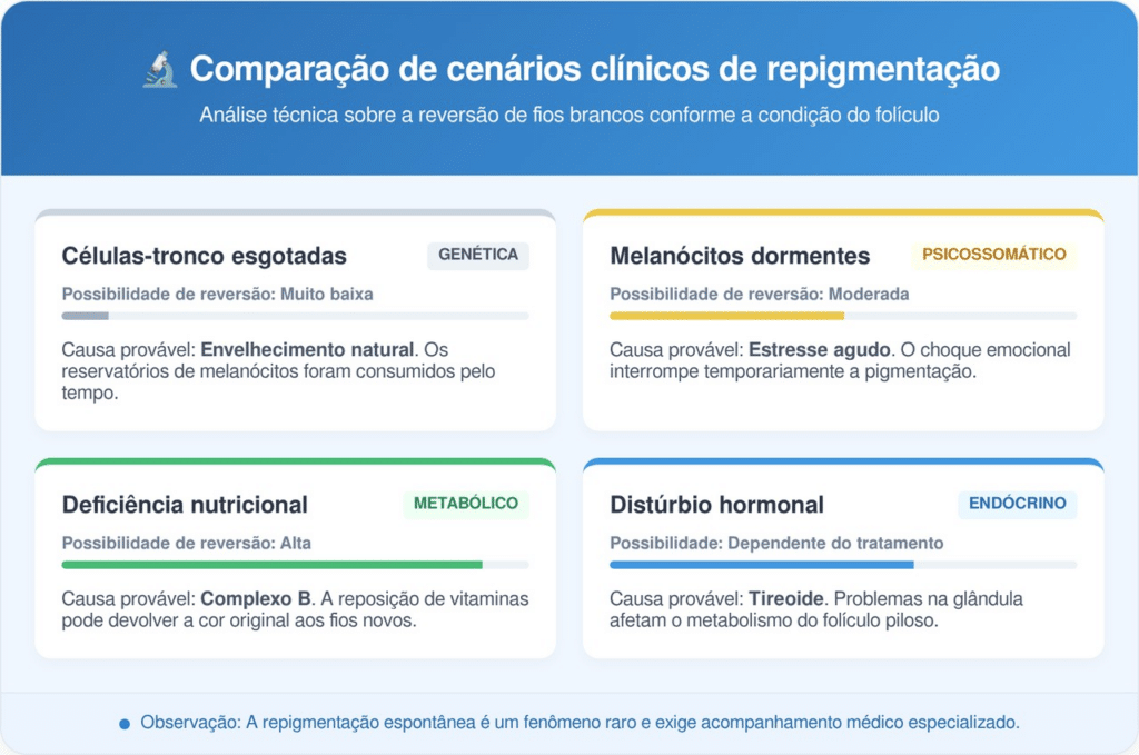 Atualmente, a ciência investiga dois caminhos: o esgotamento total das células-tronco e a dormência dos melanócitos. No primeiro caso, a reversão é improvável, mas no segundo, existe uma janela de oportunidade onde estímulos biológicos poderiam reativar a produção de melanina nos cabelos brancos.
