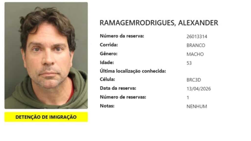 A imagem divulgada integra o sistema oficial de registros do estado da Flórida e exibe Alexandre Ramagem logo após a detenção. O material foi inserido no banco de dados de imigração dos EUA.