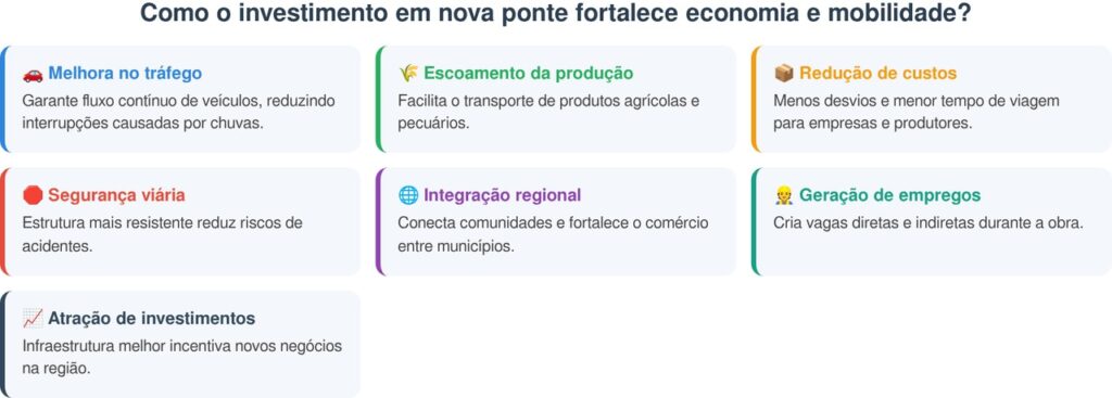 A expectativa é que a obra seja concluída em oito meses, restabelecendo não apenas o fluxo normal, mas oferecendo melhores condições do que antes, impulsionando o crescimento local. Veja os impactos regionais: