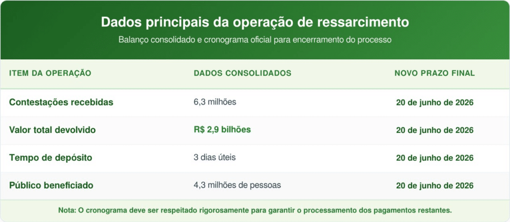 Até março de 2026, o volume de registros alcançou a marca de 6,3 milhões de contestações enviadas ao órgão. Esse movimento resultou na devolução expressiva de R$ 2,9 bilhões para cerca de 4,3 milhões de beneficiários que sofreram descontos arbitrários em suas folhas de pagamento.