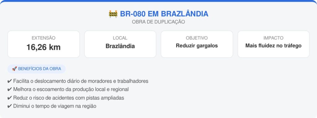 Outro destaque é a duplicação de 16,26 quilômetros da BR-080, na região de Brazlândia. A obra busca reduzir gargalos e facilitar o deslocamento de moradores e trabalhadores que utilizam a via diariamente. Veja os detalhes: