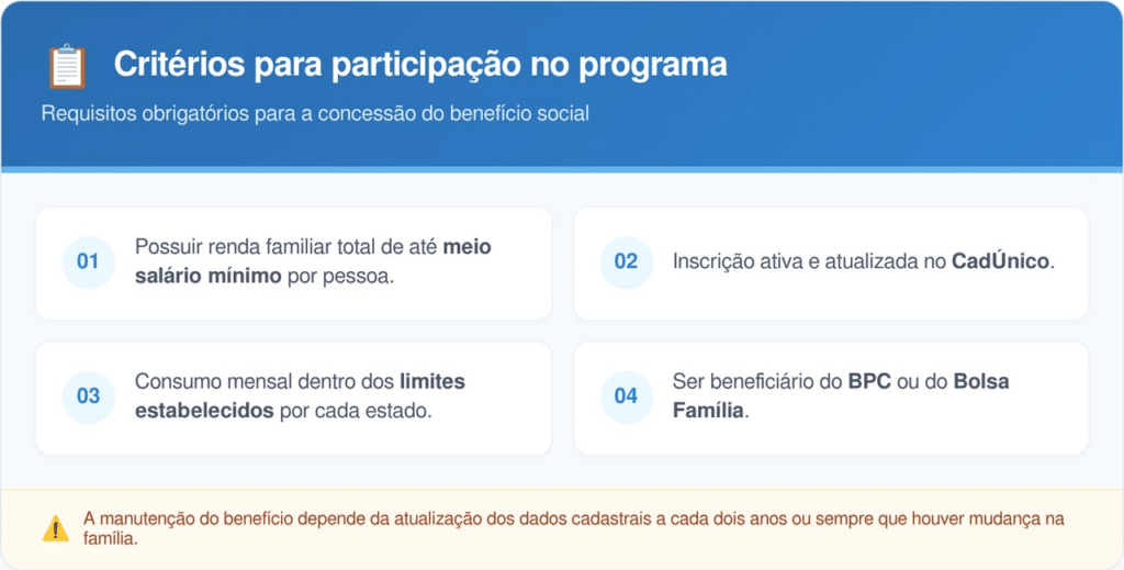 A Tarifa Social de Energia Elétrica oferece descontos escalonados na conta de luz que podem chegar a 100% para quem consome até 80 kWh por mês. Esse benefício é aplicado diretamente na fatura quando o titular da conta é o mesmo cadastrado no sistema de assistência social.