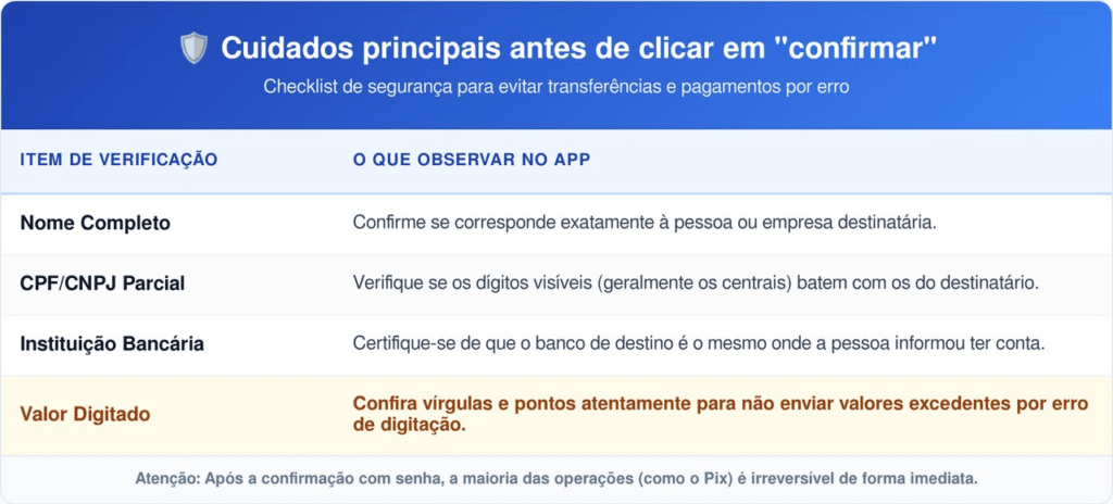 Para reduzir o risco de erros operacionais, o uso de recursos como “copiar e colar” a chave Pix ou a leitura de QR Codes é altamente recomendável. Antes de digitar a senha e confirmar a operação, o aplicativo exibe sempre os dados parciais do destinatário (nome e CPF).