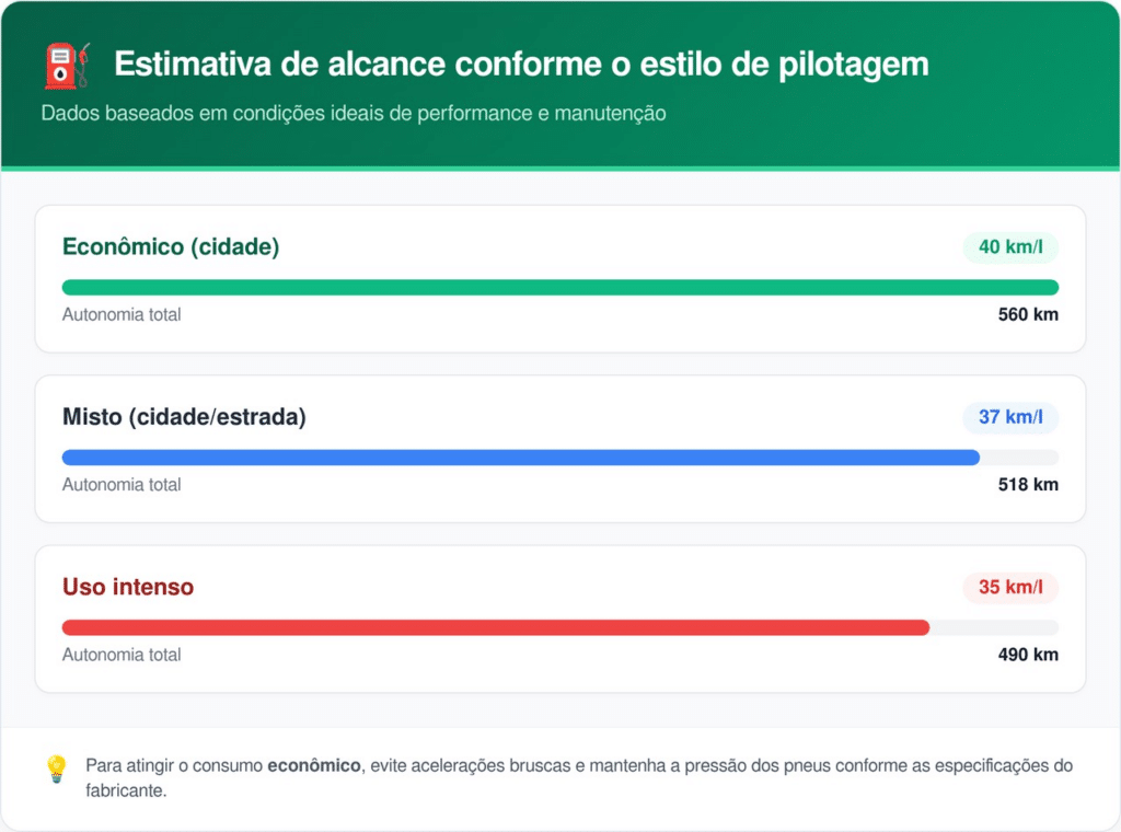 Para quem atua no setor de entregas, a distância percorrida sem paradas no posto é um diferencial competitivo. O tanque de combustível da linha atual comporta 14 litros, o que permite uma autonomia teórica que pode chegar aos 584 km em condições ideais.