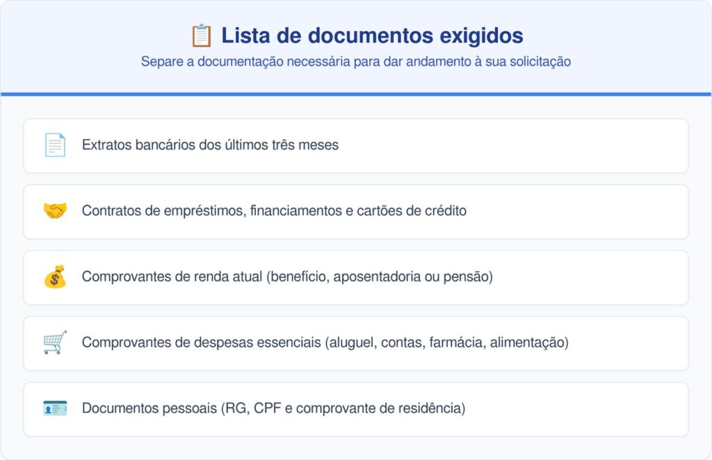 Para comprovar o superendividamento, o aposentado precisa reunir documentos que evidenciem tanto suas dívidas quanto sua condição financeira atual. Esses registros são essenciais para demonstrar que a renda disponível não é suficiente para cobrir despesas básicas e compromissos assumidos. Veja os principais itens exigidos: