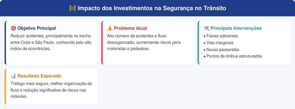 Um dos principais objetivos da concessão é reduzir acidentes, especialmente no trecho entre Cotia e São Paulo, conhecido pelo alto índice de ocorrências. As melhorias buscam tornar o tráfego mais seguro e eficiente. Veja os impactos os investimentos: