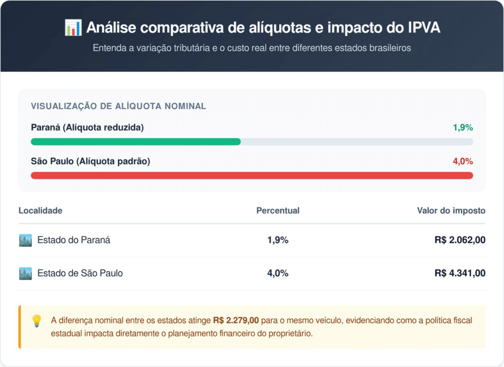 A diferença de valores entre o Paraná e estados vizinhos, como São Paulo, tornou-se abismal com a nova lei. Enquanto em solo paulista a alíquota permanece em 4%, o motorista do sul paga menos da metade por modelos idênticos.