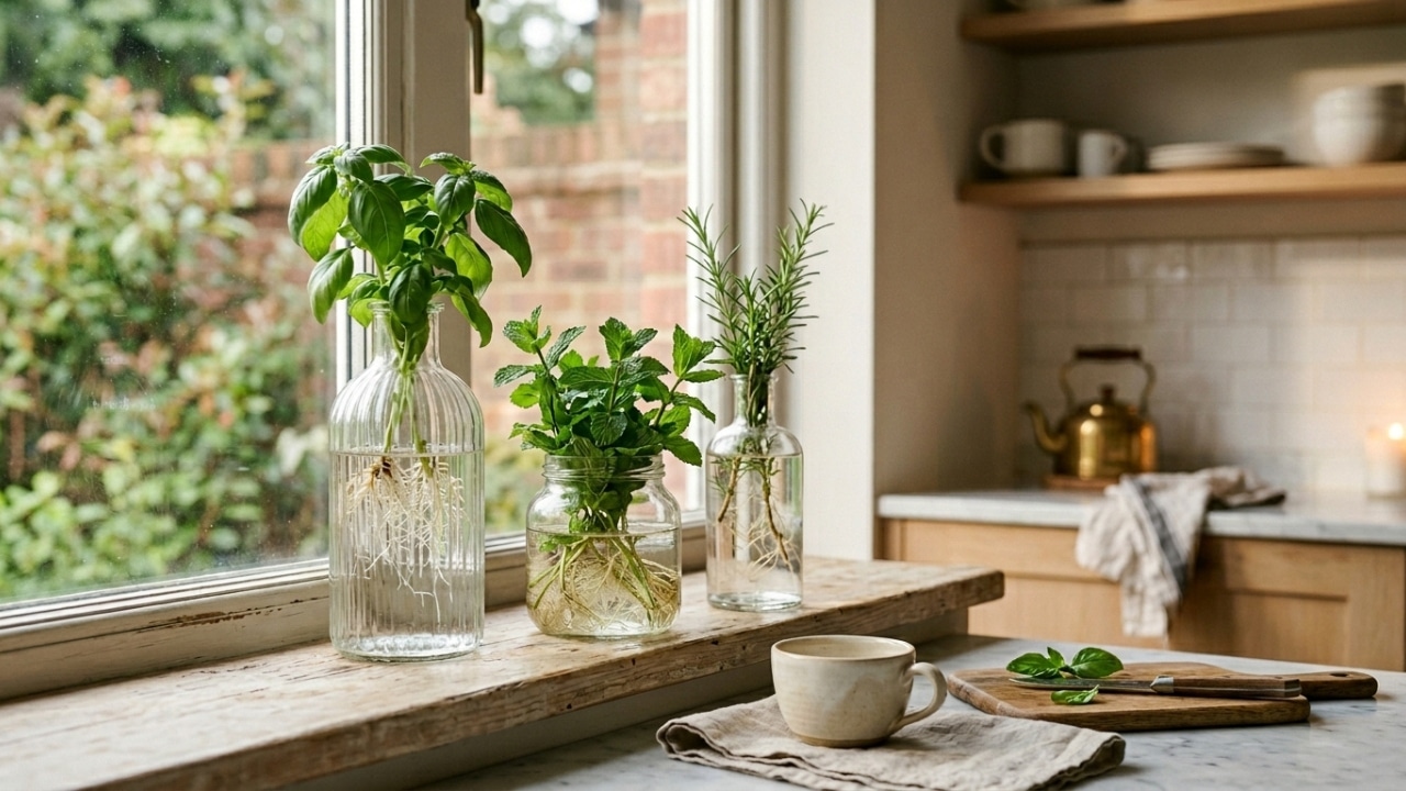 Ervas frescas na cozinha, sem terra, sem vaso e sem sujeira. O Jardim de Copo é a tendência de decoração que transforma um simples vidro com água em um elemento vivo, aromático e visualmente sofisticado, perfeito para quem quer praticidade com estilo.