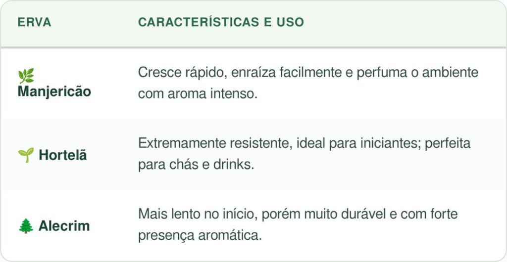 Para garantir um cultivo eficiente no Jardim de Copo, algumas ervas se adaptam melhor ao enraizamento em água. Elas possuem caules mais resistentes e facilidade de propagação, o que aumenta o sucesso da sua mini horta.