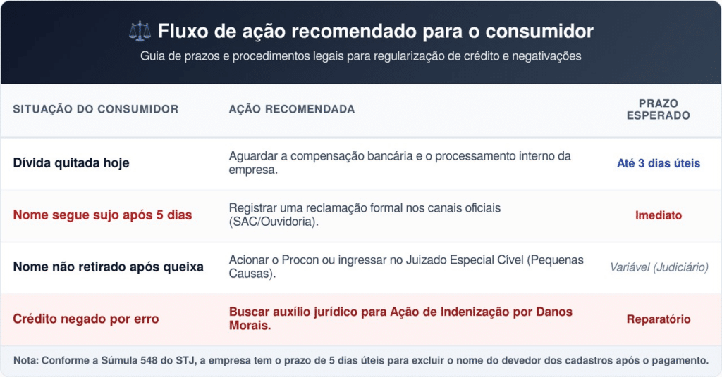 Caso o problema persista por mais de 48 horas após a reclamação, a orientação é buscar suporte jurídico especializado. Veja na tabela abaixo o fluxo de ação recomendado para o consumidor: