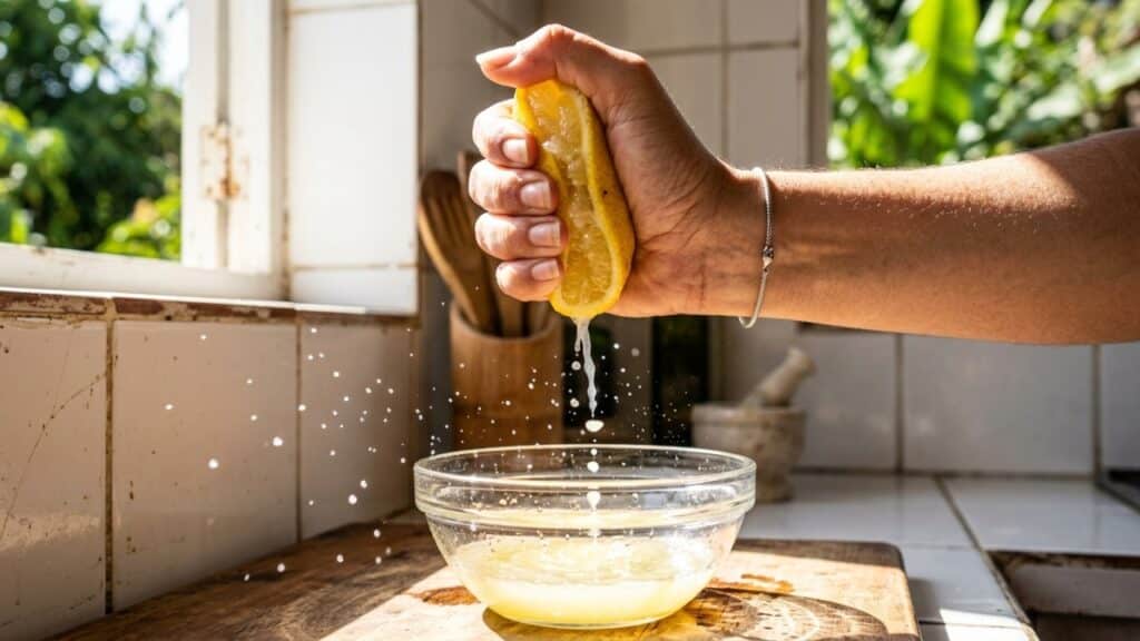 A combinação desses dois ingredientes cria uma reação química efervescente que muitos acreditam ser “limpadora”. Na realidade, essa mistura soma o potencial irritante do bicarbonato à fototoxicidade do limão, criando uma bomba química para a pele sensível das axilas, que já sofre com o atrito constante.
