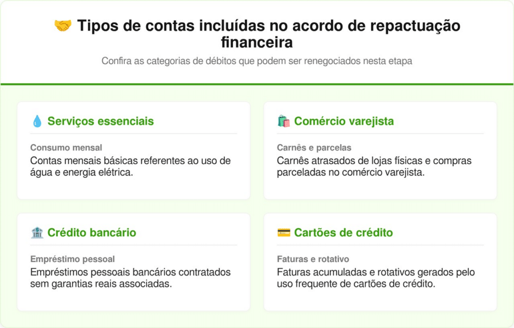 O processo oficial de conciliação atende principalmente os débitos de consumo rotineiro e contas essenciais ligadas diretamente ao custo de vida diário. A renegociação reúne todos os credores em uma única mesa para criar um plano de pagamento realista com prazo máximo de cinco anos, preservando sempre o mínimo existencial.