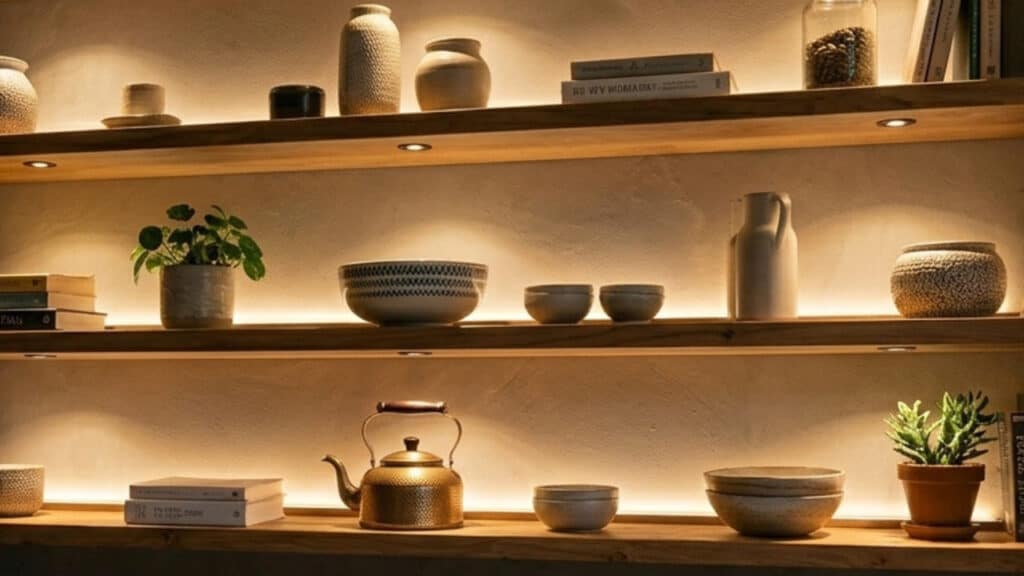 - Fitas de LED em prateleiras ou painéis