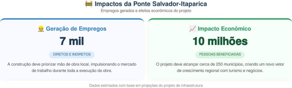 A construção da ponte deve gerar cerca de 7 mil empregos diretos e indiretos, com prioridade para mão de obra local. Esse volume de contratações deve impulsionar a economia durante toda a fase de execução. Veja os números: