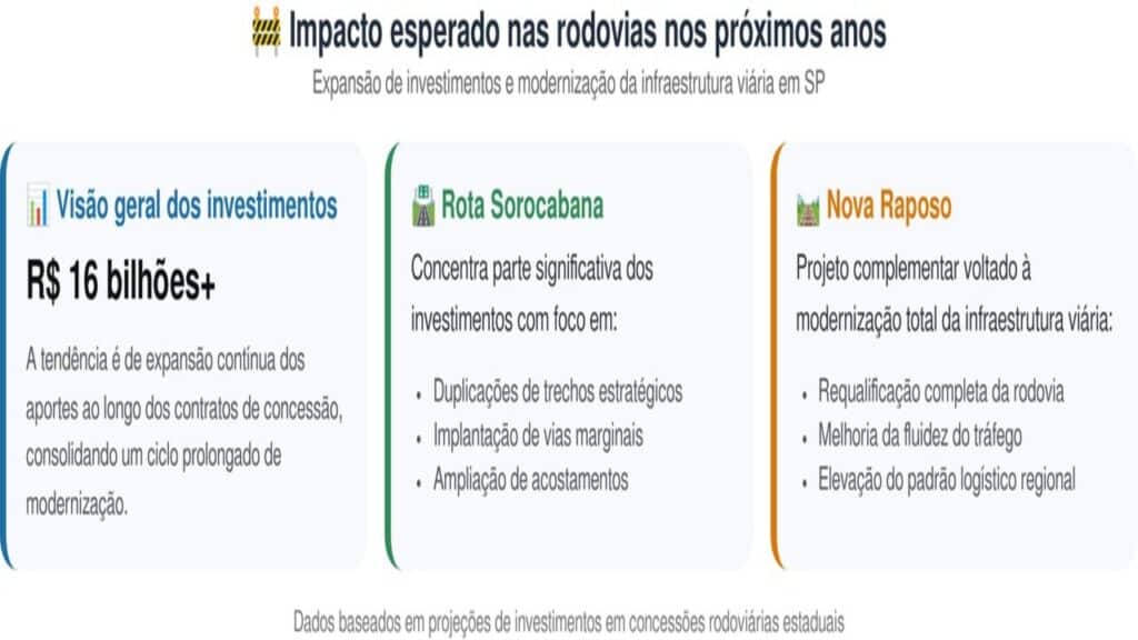 A tendência é de expansão contínua dos investimentos ao longo dos contratos. Somadas, as concessões da Rota Sorocabana e da Nova Raposo preveem mais de R$ 16 bilhões em aportes. Veja os impactos regionais: