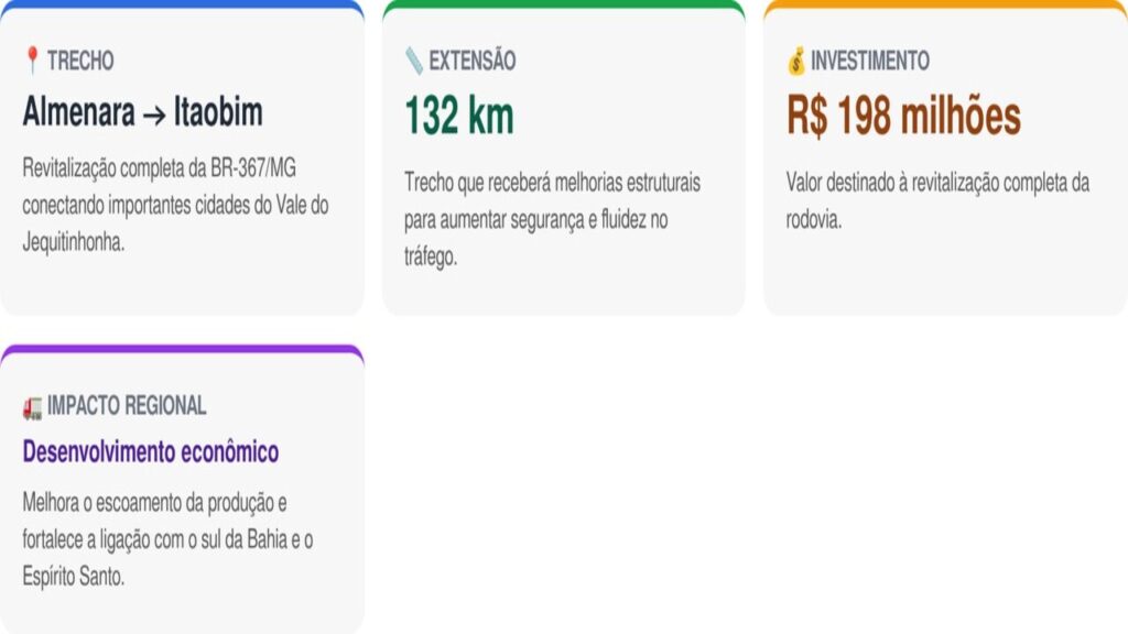 A BR-367/MG passará por um amplo processo de revitalização em um trecho de 132 quilômetros, entre Almenara e Itaobim. O investimento previsto é de R$ 198 milhões. Veja os impactos na região: