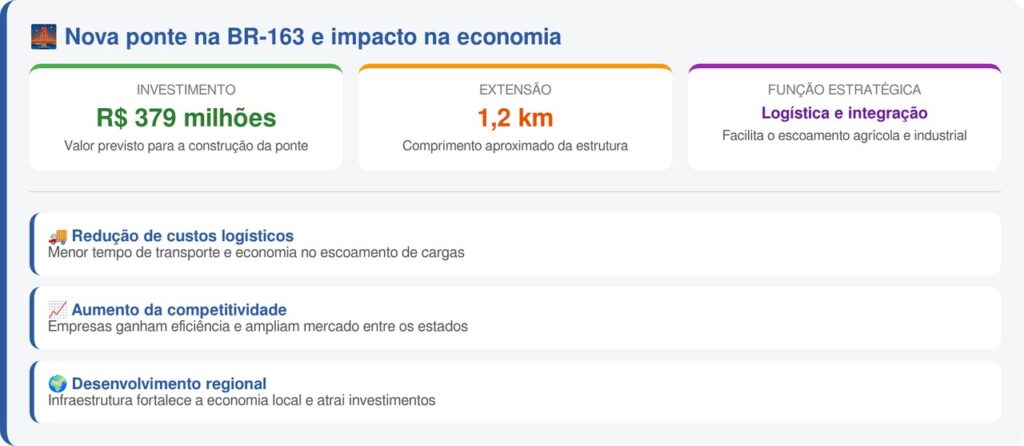 Com investimento estimado em R$ 379 milhões, o projeto prevê uma ponte com cerca de 1,2 km de extensão. A obra é considerada estratégica para o escoamento da produção agrícola e industrial. Veja os impactos regionais: