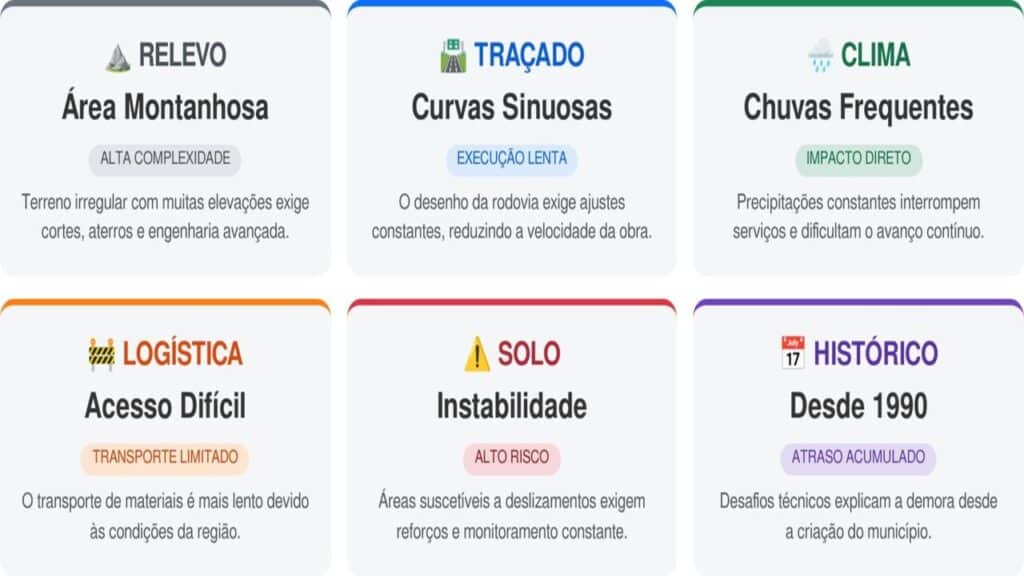 Além disso, fatores como chuvas frequentes, dificuldade no transporte de materiais e risco de instabilidade do solo aumentam a complexidade. Esses obstáculos explicam o atraso histórico desde a criação do município, em 1990. Veja os detalhes: