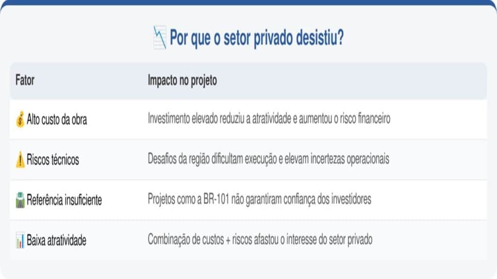 Projetos semelhantes, como o da BR-101, serviram de referência, mas não foram suficientes para garantir interesse. A combinação de desafios financeiros e operacionais afastou o setor privado. Veja os detalhes: