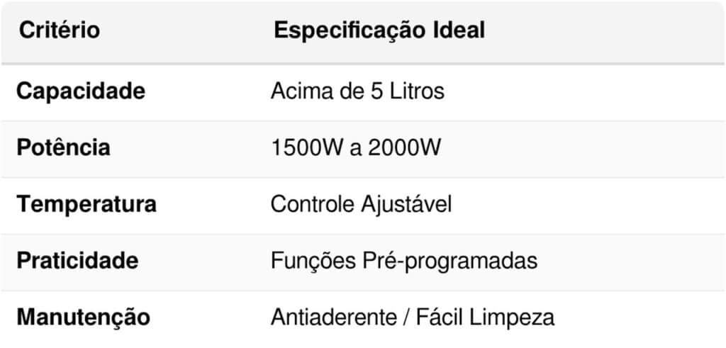 Listamos abaixo alguns critérios de avaliação para escolher a melhor air fryer grande para sua cozinha: