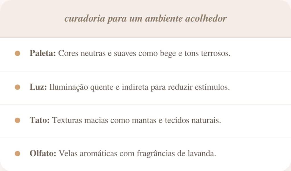 Ambientes caóticos aumentam estímulos sensoriais e mantêm o cérebro em estado de alerta. Já ambientes suaves reduzem a ativação do sistema de estresse e favorecem o relaxamento progressivo.