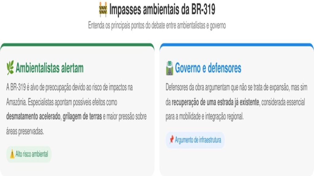 A BR-319 é alvo de debate há décadas devido ao potencial impacto ambiental na região amazônica. Ambientalistas alertam para riscos como desmatamento, grilagem de terras e pressão sobre áreas preservadas.
