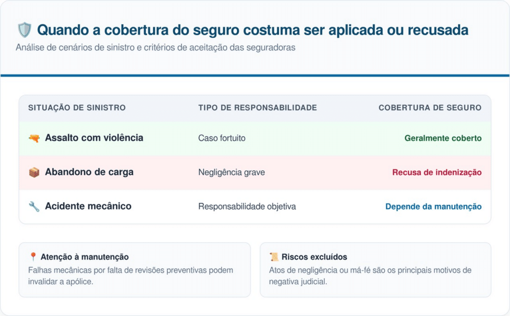 A seguradora argumentou que houve negligência grave, o que configura exclusão de cobertura. No direito brasileiro, a responsabilidade sobre o transporte é pautada por normas que você pode conferir detalhadamente na estrutura do Contrato de transporte vigente no país.
